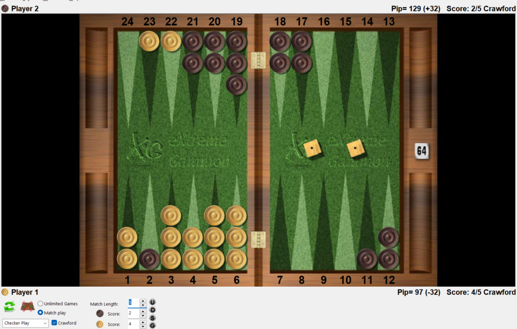 From Simon Woodhead: I would play 23/22 first. Then 6/4 3/2*. My (incorrect) thinking is that a) we must get the back checker up to the edge and make an anchor, and b) we must hit to prevent black improving and/or escaping. The score should make a difference here! 4-3 means Black can win the match with a gammon so they are on Gammon Go. If the score is 4-2, White can afford to lose a gammon.